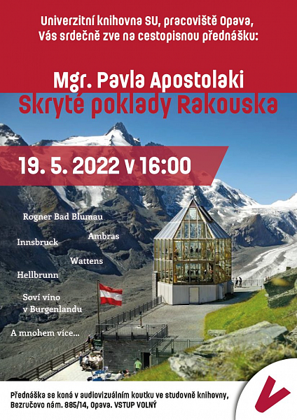 Pojďte se s námi alespoň na chvíli přenést do malebného Rakouska. Publicistka a cestovatelka Pavla Apostolaki Vám poutavě přiblíží jeho více i méně známé krásy. Přednáška se koná 19. 5. od 16:00, v audiovizuálním koutku ve studovně Univerzitní knihovny SU na Bezručově náměstí 14 a vstup je volný. Jste srdečně zváni.