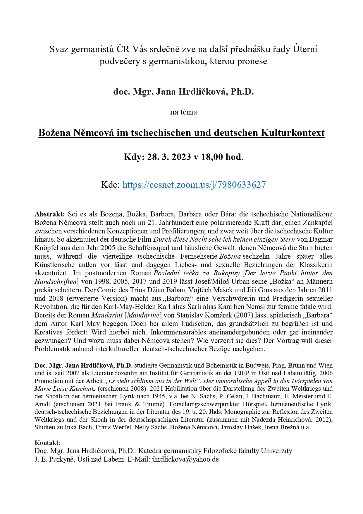 Srdečně Vás zveme na další přednášku SG ČR v letním semestru, kterou přednese doc. Mgr. Jana Hrdličková, Ph.D. z Univerzity Jana Evangelisty Purkyně v Ústí nad Labem na téma „Božena Němcová im tschechischen und deutschen Kulturkontext“.